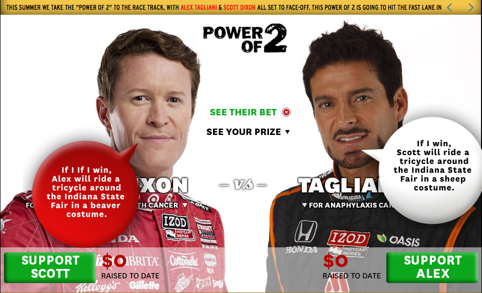 The fundraising initiative is dedicated to unlocking celebrity power for social good, but there's a catch for the IndyCar drivers; the loser has to perform an embarrassing public stunt. The loser will get into costume and ride around the grounds of the Indiana State Fair in August on a tricycle! Should Scott lose he'll be making that journey in a sheep costume, while Alex would don a beaver costume, representative of Canada. Needless to say, neither driver wants to finish second.