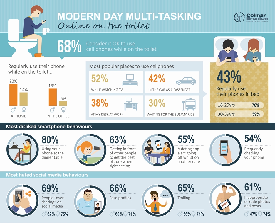 Despite the fact that women have a reputation for multi-tasking, texting on the toilet appears more of a male pastime. A total of 23% of men admitted using their phones on the toilet at home compared to 14% of women, while the divide was even more pronounced in the office with 18% of men and only 5% of women fessing up to using their cellphones while relieving themselves.