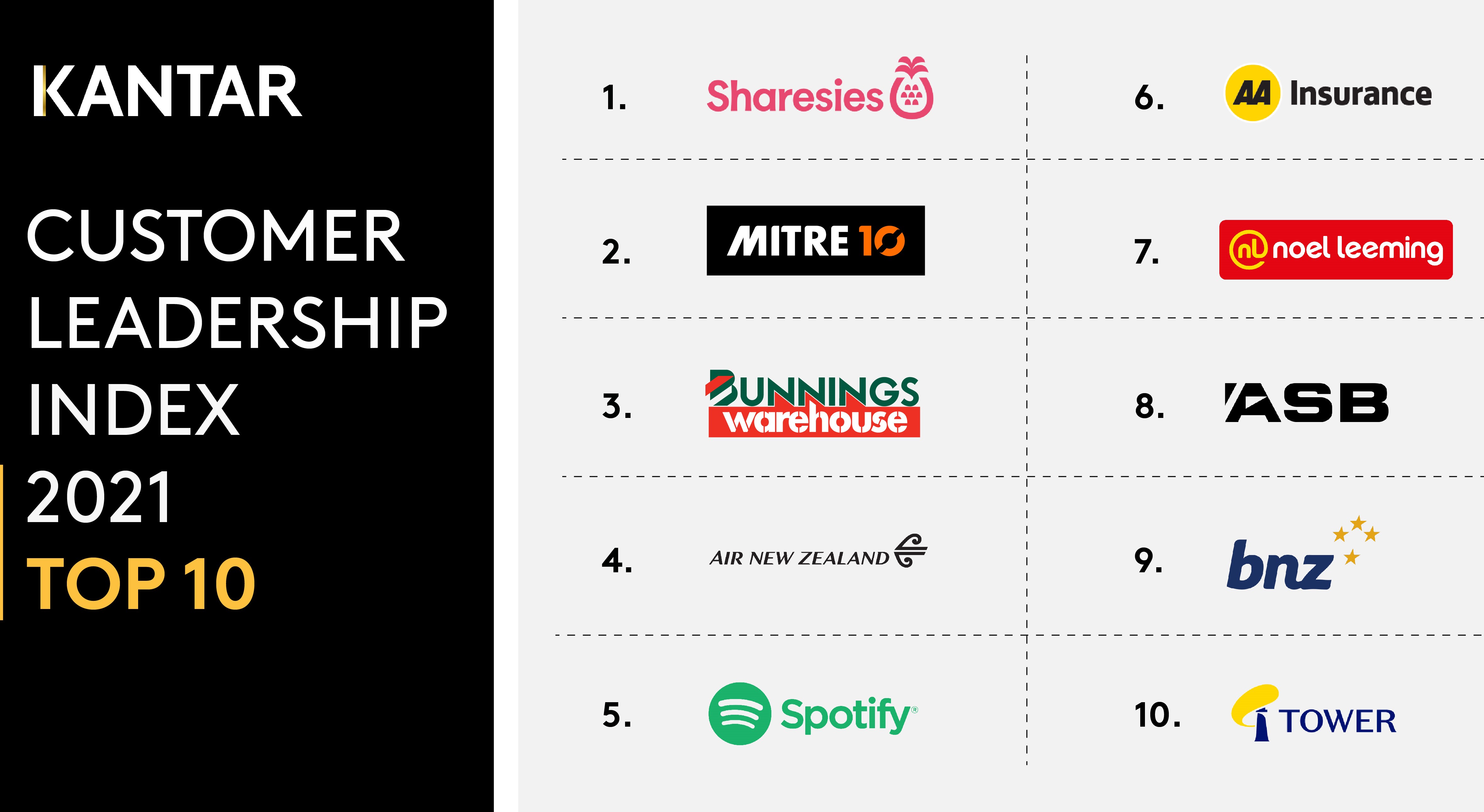 Mitre 10 and Bunnings Warehouse came in second and third, while Air New Zealand and Spotify rounded out the top five.