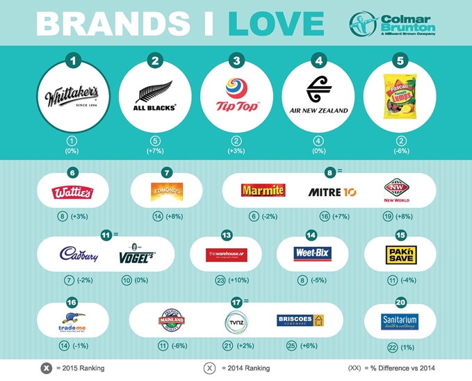 Colmar Brunton this week released the results of its annual 'Brands I Love' survey and while the All Blacks have jumped 7% to be the country's second most loved brand for 2015, Whittaker's comfortably holds on to the top spot for the fourth year in a row.